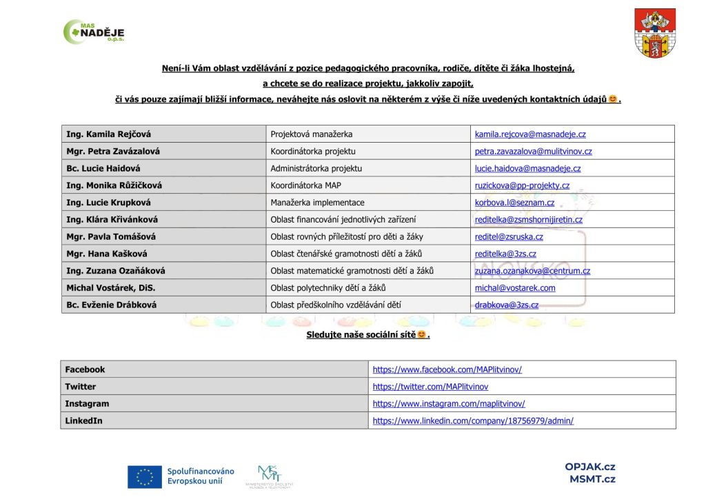Telefonní kontakt: (+420) 775 250 233 Ing. Kamila Rejčová – ředitelka MAS Naděje o.p.s.